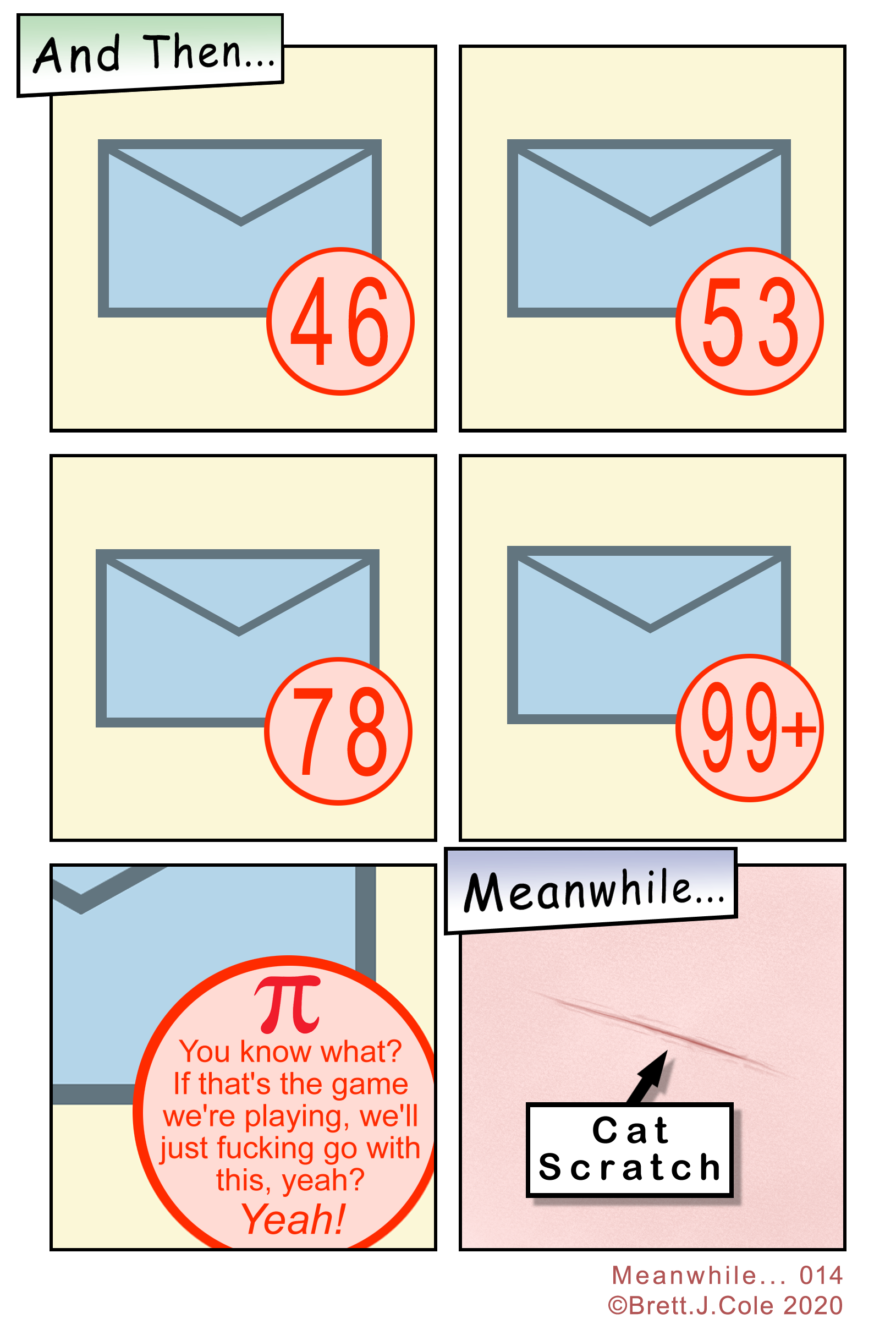 I'm not going to even embarrass myself by stating how many emails I have yet to read but probably should. Pi wouldn't even begin to cover it, though. Needless to say, I imagine my email accounts - if they were sentient (analytical intrusions notwithstanding) would be in a constant state of conniptions, not to mention digital constipation.